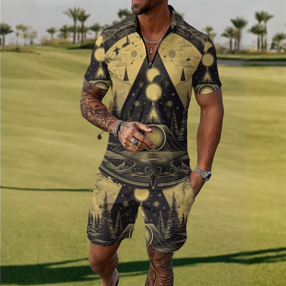 Este chándal para hombre está confeccionado con tejido de alta calidad que ofrece transpirabilidad, flexibilidad y comodidad. Su tejido es ligero y agradable al tacto, ideal para uso deportivo o informal durante la primavera y el verano. La camiseta tiene cuello alto con cremallera para un look deportivo pero a la vez elegante, mientras que los pantalones cortos tienen un corte holgado por encima de la rodilla y un cordón flexible para mayor libertad de movimiento.